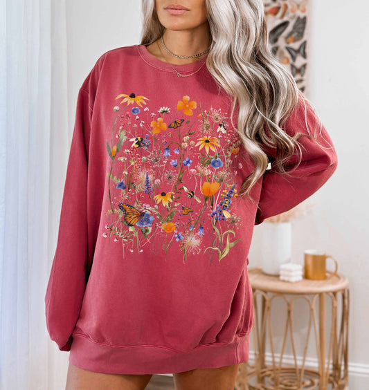 Native Wildflower Garden Comfort Color Sweatshirt, California Florals, Happy Monarch Butterfly & Bumblebee Pollinators. Choose Joy