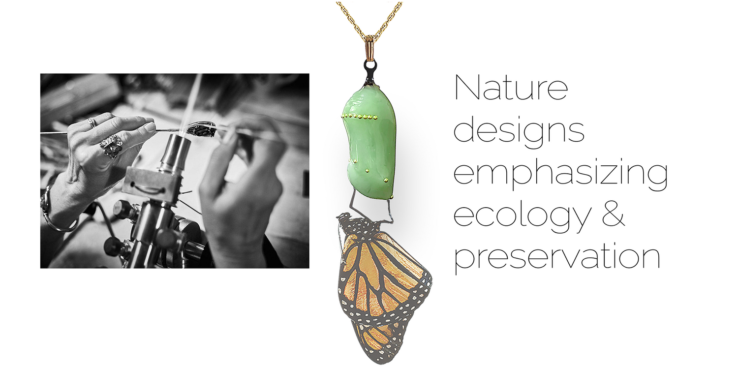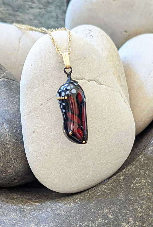 "The jade glass Chrysalis pendant I purchased is very beautiful and expertly made. I got this for my daughter who raises and releases monarchs. I’m sure she will love the gold details and how authentic this piece is. Hoping to purchase a black and orange monarch Chrysalis pendant in the future. Thank you for a true work of art!"