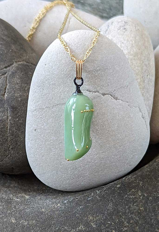 Jade-colored Monarch chrysalis replica, art glass and 24k gold