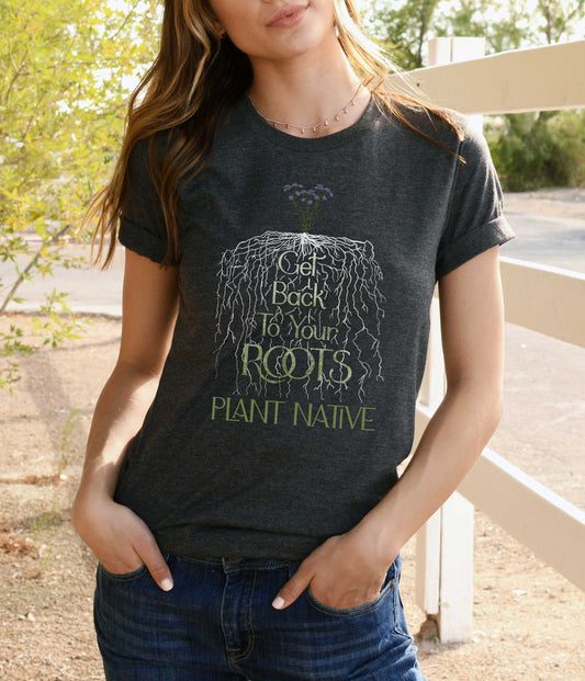 Plant Native, Get Back to Your Roots tee, Nature t-shirt for conservation, Environmental science gift for ecological teachers & gardeners.