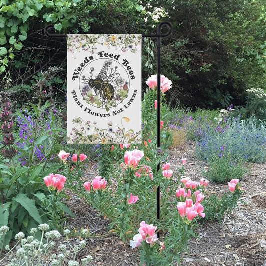 Weeds Feed Bees Garden Flag Banner, gardener gift, conservation, healthy yard message to protect our pollinators! Multi not monoculture