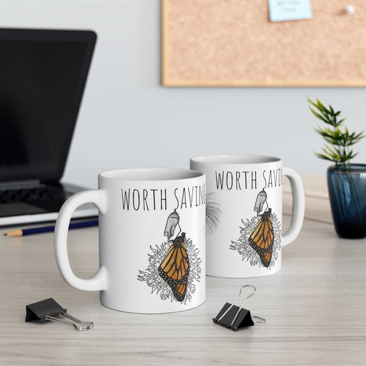 Worth Saving Monarch Chrysalis Eclosed Mug 11oz, Worth Saving, Environmental cause, nature lover, entomologist, metamorphosis, gardener gift